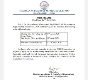 Shillong, Iaiong 7: U Director Accreditation bad u Controller ka Examination ka Meghalaya Board Of School Education u bah T.R. Laloo u la pyntip ba ka Board kan sa pynlong ia ka supplementary examination 2026 na ka bynta kito kiba phel ia ka SSLC 2026 kan long naduh ka 1/Jymmang /2026 haduh ka 8/Jymmang/2026.