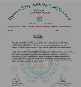 Shillong, Kyllalyngkot 15: Ka Hynniew Trep A.chik National Movement (HANM) Garo Hills Region ka pynrem jur ïa ka jingpynïap bad thang ïa u dkhot ka ACHK NGO, uba la khlad noh u Dilseng M Sangma ha ka 9 tarik u Kyllalyngkot ba la leit ha ka jaka ba la tip kum ka Goalgaon da ki briew na Bangladesh bad ngi kyrpad jur ïa ka Tnad Pulit ka HANM Garo Hills Region ba kan pynlong ka jingtohkit kaba stet ïa kito kiba donkti bad ban pynshitom ïa ki katkum ka aiñ.